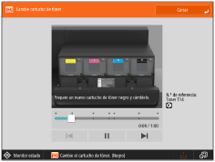 Es posible consultar las instrucciones completas de sustitución del cartucho de tóner pulsando <Anterior> o <Siguiente> en la pantalla táctil. Si se agota el tóner durante un trabajo de impresión, las impresiones restantes se hacen después de sustituir el cartucho de tóner. Si queda tóner negro, podrá continuar imprimiendo en blanco y negro. Sin embargo, si un trabajo se interrumpe debido al agotamiento del tóner cian, magenta o amarillo, la impresión en blanco y negro solo será posible para funciones que no sean la que esté utilizándose para el trabajo interrumpido. Después de sustituir los cartuchos de tóner, si los colores impresos son diferentes a los obtenidos antes de sustituir los cartuchos de tóner, realice <Ajuste auto de gradación> en <Ajuste/Mantenimiento> (Configuración). Ajustar la gradación |