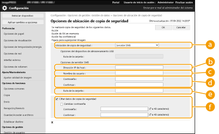 Tras realizar la copia de seguridad, puede hacer clic en [Registro de copia de seguridad/restauración] en la pantalla que aparece en el paso 6 para consultar los resultados de la copia de seguridad en [Resultado]. Si aparece el mensaje [Se ha producido un error del servidor.], es posible que las opciones de red no estén bien configuradas. Compruebe las opciones de red. La copia de seguridad de los datos se puede restaurar no solo en el equipo, sino también en actualizaciones del mismo modelo. |