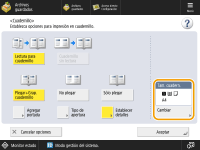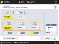 PaperHay restricciones en cuanto al papel que se puede utilizar con esta función. Tome nota de lo siguiente. Para obtener información sobre las restricciones de papel para cada opción, consulte Especificaciones del hardware. En función del tamaño y el tipo de papel, es posible que la impresión de cuadernillos no esté disponible. El número de hojas que se pueden imprimir con grapado de cuadernillo es limitado. Existen limitaciones con respecto al papel que se puede usar para el contenido y las portadas. |