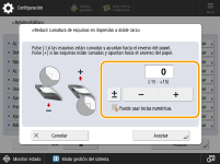 Este modo puede afectar a la alimentación del papel. Como aumentar en un alto grado el valor puede provocar atascos de papel, se recomienda ajustar los valores en incrementos pequeños. Si una esquina se dobla mientras se imprime en ambas caras, ajustes de corrección de curvatura inadecuados en la primera cara de la impresión a dos caras pueden provocar un atasco de papel. |