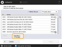 Puede utilizar la lista desplegable Ordenar lista para ordenar la lista por la fecha, el nombre, o el gramaje básico, en orden ascendente o descendente. La información detallada del papel seleccionado se puede mostrar si se pulsa <Detalles> Puede cambiar páginas pulsando [  ]/[  ] para seleccionar y guardar tipos de papel que aparecen en otras páginas. |