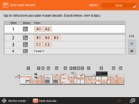 Es posible que no haya papel atascado en el lugar donde usted compruebe. Incluso en ese caso, siga las instrucciones de la pantalla para comprobar todas las ubicaciones. La pantalla que indica que hay un atasco de papel seguirá apareciendo hasta que retire el atasco de papel. Si pulsa <Cerrar> en la pantalla que indica que hay un atasco de papel, podrá seguir realizando operaciones y especificando opciones sin eliminar el atasco de papel de inmediato. No retire el papel de una ubicación que no sea la ubicación de atasco de papel que se muestra en la pantalla. De lo contrario, podría producirse un atasco de papel en otros lugares o podrían faltar páginas en los documentos impresos. |