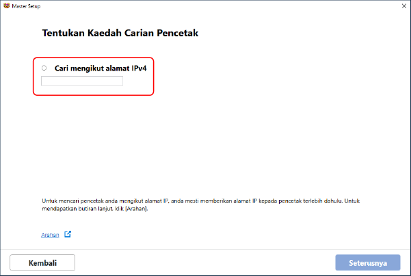 Anda boleh mencari Printer dengan menentukan alamat IP. Carian ini memerlukan anda untuk mengesahkan alamat IP Printer terlebih dahulu.