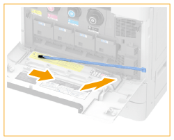 清洁完稿台玻璃、输稿器和主要部件之后,如果依然出现白色条纹或其他打印缺陷,可能是防尘玻璃脏了。在这种情况下,遵照以下步骤清洁防尘玻璃。
