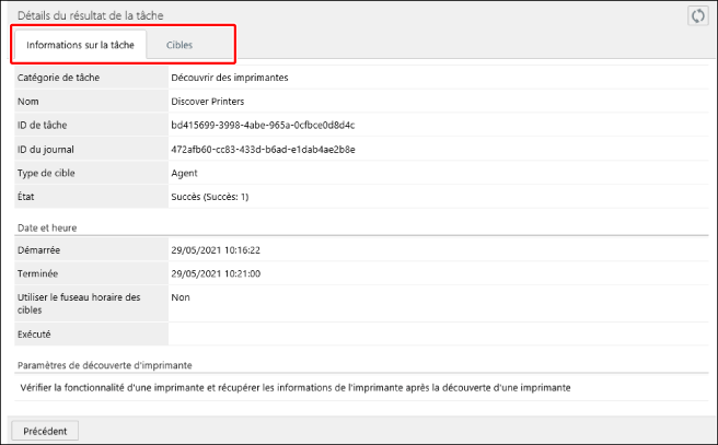 Sur la page [Détails du résultat de la tâche], vous pouvez cliquer sur l'onglet pour changer l'affichage.