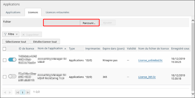 [Expire dans (jours)] | Affiche la période de validité de la licence à compter de l'installation de l'application. Pour les licences avec une période de validité indiquée en nombre de jours, le nombre de jours restant avant l'expiration de la licence est affiché. [N'expire pas] s'affiche lorsque « * » est indiqué comme période de validité dans le fichier de licence. |