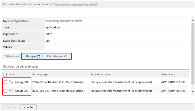 [Nom de l'application] | Affiche le nom de l'application. Si l'application correspondant à un fichier de licence n'est pas enregistrée dans ce logiciel, l'ID de l'application s'affiche. Cependant, même si une application n'est pas enregistrée dans ce logiciel, son nom d'application peut être affiché s'il s'agit d'une application connue (telle qu'une option d'imprimante). |