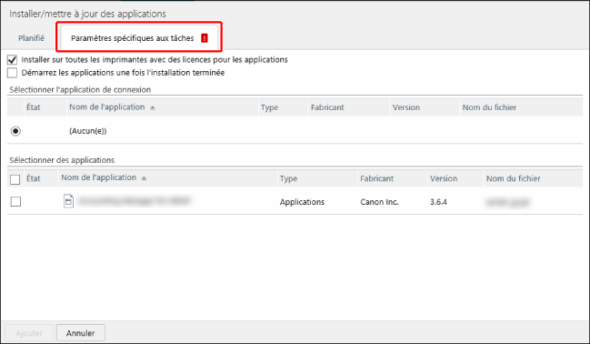 Si vous sélectionnez pour une tâche la même version d'une application que la version déjà installée sur une imprimante, l'application n'est pas installée. |