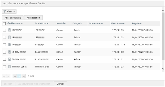 Wiederherstellen entfernter Geräte für die Verwaltung/Löschen von Geräten aus dieser Software
