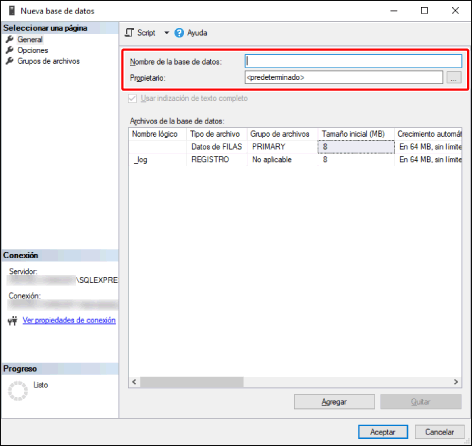 Se volverá a abrir la pantalla [Configuración del Motor de base de datos].