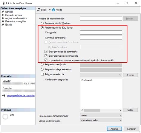 Cree un usuario para iniciar sesión en SQL Server y establezca dicho usuario como propietario de la base de datos para este software.