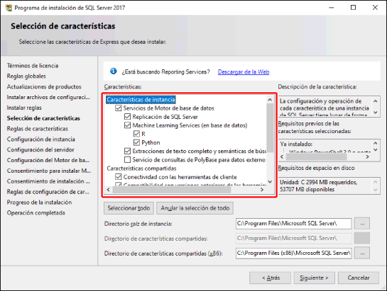[Machine Learning Services (en base de datos)] y las funciones de abajo no se requieren para el funcionamiento de este software. Desmárquelas si no desea instalarlas.