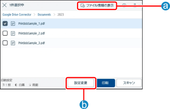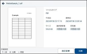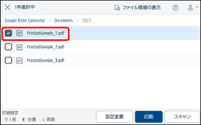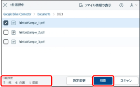 プリント可能なファイルのみ、リストに表示されます。 複数のファイルを選択できます。 フォントが埋め込まれていないPDFファイルをプリントすると、別のフォントに置き換えられ、意図しないプリント結果になる場合があります。 |