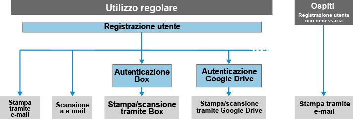 La stampa da un servizio cloud e la scansione su un servizio cloud possono essere eseguite configurando le impostazioni di autenticazione per il servizio cloud dopo aver effettuato la registrazione utente.