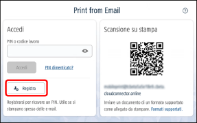 La registrazione utente non è necessaria se si usa solo la funzione di stampa tramite e-mail, ma risulta comoda in caso di uso ripetuto della funzione. Per informazioni su come si usa la funzione di stampa tramite e-mail senza la registrazione utente, fare riferimento a quanto segue. |