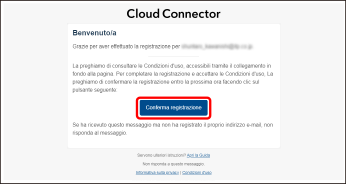 A seconda delle impostazioni del client di posta elettronica in uso, l'e-mail inviata da Cloud Connector potrebbe arrivare nella cartella della posta indesiderata. Prima di procedere alla registrazione, configurare il proprio client di posta elettronica in modo da consentire la ricezione dei messaggi provenienti dal dominio "cloudconnector.online". |