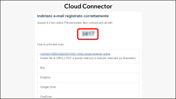 Il codice PIN non può essere utilizzato con Cloud Connector su un'altra stampante multifunzione. La registrazione utente deve essere eseguita su ciascuna stampante multifunzione in modo da ottenere un codice PIN. Se il codice PIN viene dimenticato, è possibile ottenerne un altro. Per maggiori informazioni, fare riferimento a quanto segue. |