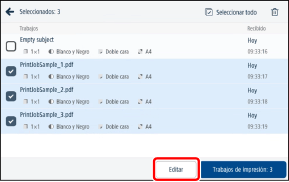 Pulse [Editar] en la parte inferior derecha de la pantalla para cambiar los ajustes de impresión del trabajo seleccionado.