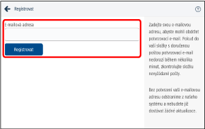 Při registraci uživatele zaregistrujte do nástroje Cloud Connector e-mailovou adresu. Je třeba zaregistrovat e-mailovou adresu umožňující odesílat a přijímat přílohy. Funkce Tisk přes e-mail funguje tak, že soubor, který chcete vytisknout, odešlete ze zaregistrované e-mailové adresy. Funkce Skenování přes e-mail funguje tak, že naskenovaná data odešlete na zaregistrovanou e-mailovou adresu.