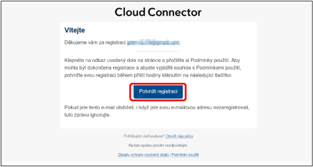 Je možné, že e-mail zaslaný z aplikace Cloud Connector přijde do složky pro nevyžádanou poštu. Závisí to na nastavení e-mailového klientu. Před provedením registrace nakonfigurujte e-mailového klienta tak, aby bylo povoleno přijímání e-mailů z domény „cloudconnector.online“.