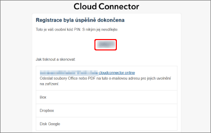 Tento kód PIN nelze použít s nástrojem Cloud Connector na jiné multifunkční tiskárně. Uživatele je třeba zaregistrovat na každé multifunkční tiskárně, aby byl vydán kód PIN.