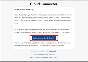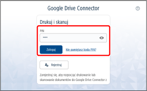 Drukowanie/skanowanie przy użyciu usługi w chmurze można wykonać wprowadzając kod PIN w aplikacji Cloud Connector. Logowanie do usługi w chmurze nie jest konieczne.