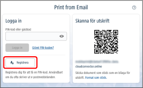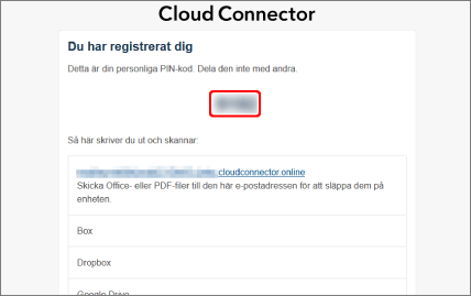 PIN-koden går inte att använda med Cloud Connector på en annan multifunktionsskrivare. Användarregistreringen måste utföras på varje multifunktionsskrivare för att få en PIN-kod.