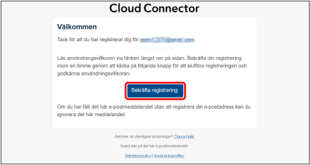 E-postmeddelandet från Cloud Connector kan ha hamnat i skräppostmappen, beroende på inställningarna i din e-postklient. Innan du slutför registreringen ska du konfigurera e-postklienten så att den tillåter e-postmeddelanden från domänen ”cloudconnector.online”.