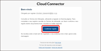 O e-mail enviado do Cloud Connector pode ser colocado em uma pasta de spam, dependendo das configurações do seu cliente de e-mail. Antes de realizar o registro, configure seu cliente de e-mail para permitir o recebimento de e-mails do domínio "cloudconnector.online". |