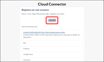 O código PIN não pode ser usado com o Cloud Connector em outra impressora multifuncional. O registro de usuário deve ser realizado em cada impressora multifuncional para emitir um código PIN. Caso se esqueça do Código PIN, você poderá emitir outro. Para obter mais informações, consulte o seguinte. |