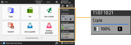 El historial de los diez últimos elementos se conserva en el cronograma en orden cronológico. El historial de los trabajos anteriores se elimina del cronograma. Cuando el trabajo anterior al último se vuelve a utilizar, el orden de los dos primeros trabajos se invierte, pero el número de trabajos en el cronograma sigue siendo el mismo. Sin embargo, si las opciones se cambian después de ser recuperadas, quedan determinadas como nuevas opciones. ![]() Para eliminar el historial que se ha añadido automáticamente o para almacenar las opciones de ese historial en la pantalla de <Inicio> como botón personal/compartido, mantenga pulsado el historial. Sin embargo, <Mostrar pantalla de confirmación al rellamar> y <Iniciar recuperación (la operación se iniciará al pulsar el botón).> no pueden configurarse al registrar un botón personal/compartido desde el cronograma. Registro de botones personales/compartidos Si se establece <Restringir reenvío desde registro> en <Sí>, no se retiene en el cronograma el historial de "Fax" y "Leer y enviar". Las siguientes contraseñas pueden incluirse en el cronograma de cada usuario registrado. Contraseñas de registro para servidores de archivos de destino para Leer y enviar Contraseñas de cifrado para Leer y guardar (<Solicitar contraseña para abrir documento> y <Solicitar contraseña para camb. permis.>) Puede cambiarse si se incluye o no la contraseña en el cronograma de los usuarios registrados en <Prohibir almacenam. de contraseña de autenticación>. Sin embargo, la contraseña en <Contraseña> para la función de fax se conserva en el cronograma, con independencia de la opción <Prohibir almacenam. de contraseña de autenticación>. La contraseña no se retiene en el cronograma para los usuarios autenticados o los usuarios invitados independientemente de la opción <Prohibir almacenam. de contraseña de autenticación>. Sin embargo, si se establece la contraseña en <Contraseña> para la función de fax, esta no se mostrará en el cronograma. Si <Gestionar núms. acceso libretas direcciones> se establece en <Sí>, el registro de trabajos de envío ("Fax" y "Leer y enviar") para usuarios autenticados y usuarios invitados no se muestra en el cronograma. El historial de configuración del usuario que ha iniciado sesión puede compartirse con varios equipos como datos de personalización mediante la sincronización de la configuración. Lista de elementos que se pueden personalizar Con Archivos guardados, los archivos se guardan en el cronograma junto con las opciones que se usan para imprimirlos. No se puede seleccionar otro archivo y reutilizar solo las opciones. Tampoco pueden usarse las opciones del cronograma correspondiente si se ha eliminado o trasladado un archivo. |