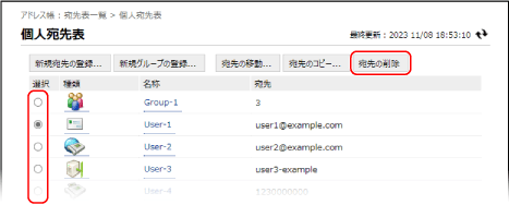 削除する宛先を選択し、[宛先の削除]をクリックする