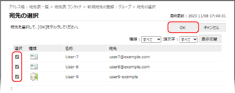 グループに登録する宛先にチェックマークを付け、[OK]をクリックする