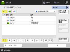 スキャン/ファクスの画面からアドレス帳を呼び出すと、以下の画面が表示されます。