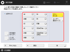 また、手差しトレイに用紙をセットしたときに表示する画面を、「よく使う用紙」を選択する画面にして、ワンタッチで用紙サイズと用紙種類を設定できるようにすることもできます。