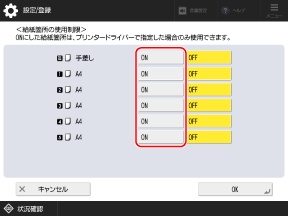 給紙部ごとに、ユーザーによる使用を制限するかどうかを設定できます。特殊な用紙などを給紙部にセットした場合に、その用紙が誤って使用されないようにできます。
