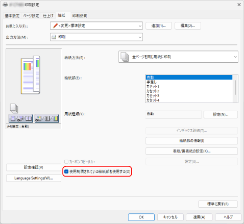 [給紙]タブで、[使用制限されている給紙部も使用する]にチェックマークを付ける