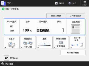 クイック画面に切り替えると、拡大/縮小や両面コピーなどの基本的な機能の設定値がボタンで表示されます。それらの機能は、表示されている設定値のボタンを押すだけで設定ができるため、シンプル画面よりも少ない手順で設定することができます。