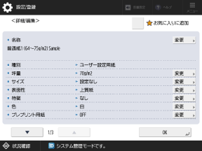 [用紙種類の管理設定]を押し、用紙種類を選択して[詳細/編集]を押すと、[詳細/編集]画面が表示されます。