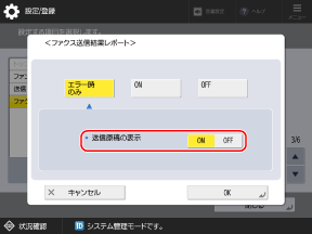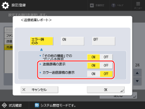 エラー時にのみレポートをプリントする場合は、[エラー時のみ]を選択します。その場合に、スキャンやファクスの画面で、レポートをプリントするかどうかを設定できるようにするときは、[「その他の機能」 でのプリントを許可]を[ON]に設定します。