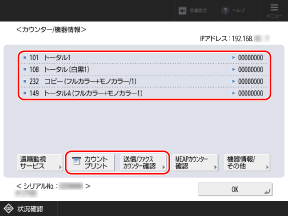 [カウンター/機器情報]画面の「トータル」や「コピー」と表示されている項目で、プリント/コピーしたページ数を確認できます。