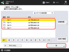 通知先には、アドレス帳に登録されている宛先(個人宛先表とユーザーグループ宛先表の宛先は除く)、またはログインユーザーのメールアドレスを設定できます。