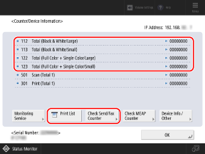 You can check the numbers of printed and copied pages by referring to the items indicated by "Total" or "Copy" on the [Counter/Device Information] screen.