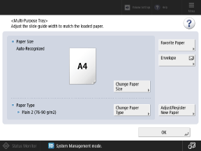 Fixing the Paper Size and Type to Use in the Multi-purpose TrayIf the width of the loaded paper is different from the fixed size width, a message indicating that the width does not match is displayed. In this case, cancel the fixed setting and reload the paper in the multi-purpose tray.