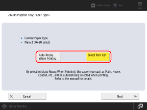 * If you set a specific paper type in the printer driver, press [Select from List] and manually configure the paper type setting for the machine. Do not use [Auto-Recog. When Printing].