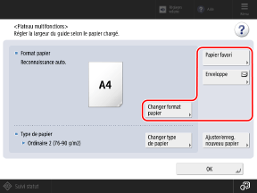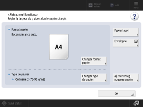 Lorsque du papier est chargé dans le plateau multifonctions, l'écran suivant s'affiche sur le panneau de commande. Réglez le format et le type de papier en fonction du papier chargé.