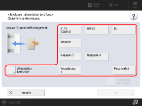 Appuyez sur [Alimentation bord long] ou [alimentation bord court] en fonction de l'orientation des enveloppes chargées, puis sélectionnez le format des enveloppes.