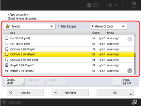 Pour configurer un type de papier enregistré personnel, enregistrez le format et le type en tant que papier fréquemment utilisé, et utilisez [Papier favori] pour rappeler ce papier.