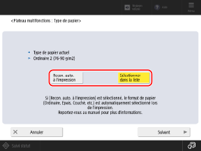 * Si vous spécifiez un type de papier dans le pilote d'imprimante, appuyez sur [Sélectionner dans la liste] et configurez manuellement le réglage de type de papier pour la machine. N'utilisez pas [Recon. auto. à l'impression].