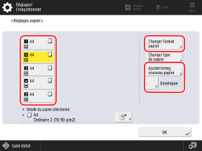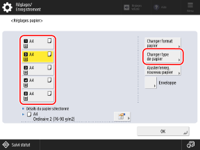 Par défaut, le type de papier est réglé sur Ordinaire 1 ou Ordinaire 2. Lorsque vous chargez du papier d'un autre type ou que le format affiché sur le panneau de commande est différent de celui du papier chargé, changez les réglages relatifs au papier.